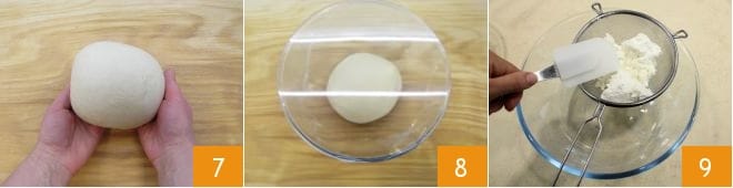 Neste ponto, coloque a massa em uma superfície de trabalho e dê-lhe uma forma esférica com as mãos 7. Coloque-a em um recipiente, cubra com filme plástico 8 e deixe levedar por pelo menos 4 horas no forno desligado com a luz acesa (em uma temperatura entre 26-30° no máximo). Enquanto isso, coloque a ricota em uma peneira e leve à geladeira por 3-4 horas para que perca o excesso de líquido 9. Se você quiser preparar a versão com gotas de chocolate, coloque-as em uma tigela pequena e congele por pelo menos 30 minutos, para que não derretam durante o cozimento.