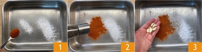 Para preparar o kebab feito em casa, primeiro prepare a marinada para a carne: em uma travessa grande, adicione o sal, a páprica 1, a pimenta 2 e os dentes de alho descascados e ligeiramente esmagados 3.