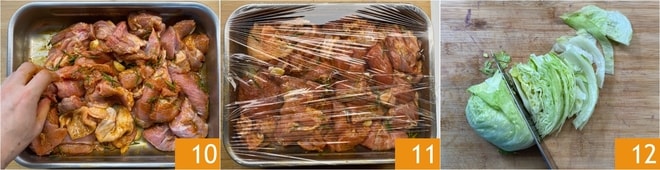 Massageie a carne com as mãos para temperá-la uniformemente com a marinada 10, depois cubra com filme plástico e deixe marinar na geladeira por pelo menos 4 horas 11. Próximo ao final do tempo de marinada, prepare os vegetais: lave a alface e corte-a em tiras finas 12.