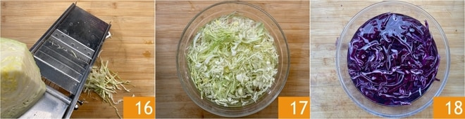 Por fim, corte o repolho branco com um mandoline 16 e coloque-o de molho em água fria 17. Faça o mesmo com o repolho roxo 18.