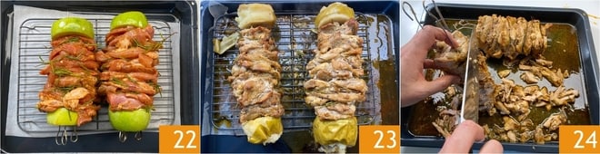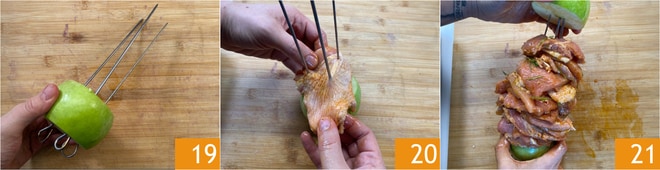 Retire a carne da geladeira. Pegue uma maçã e remova a parte inferior e superior, depois divida-a ao meio no sentido horizontal. Insira 3 espetos de aço em uma metade da maçã 19, depois espete as fatias de carne nos espetos, alternando o frango com a vitela 20. Depois de chegar ao fim, feche o espeto com a outra metade da maçã 21. Proceda da mesma forma para formar o segundo espeto.