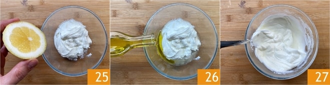 Por último, prepare o molho de iogurte: coloque o iogurte grego em uma tigela, depois adicione o suco de limão 25 e o azeite 26 e misture bem 27. Se desejar, pode adicionar algumas gotas de tabasco.