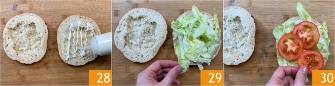 Nesse ponto, escorra e seque os vegetais, depois você está pronto para montar seu kebab: corte a pita ao meio e espalhe um lado com o molho de iogurte 28, depois adicione a alface 29 e os tomates 30.