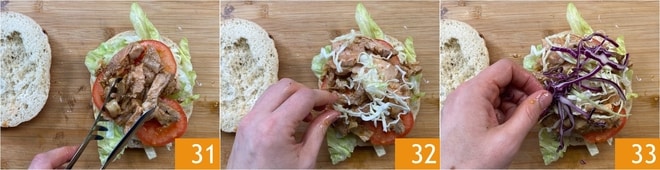 Continue com as fatias de carne 31, o repolho branco 32 e o repolho roxo 33.