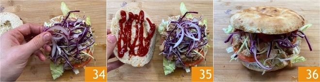 Complete com a cebola roxa 34, depois feche com a outra metade do pão espalhada com ketchup 35. Prossiga da mesma forma para montar todos os outros pães. Seu kebab feito em casa está pronto para ser saboreado 36!
