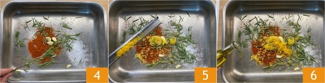 Adicione as folhas de alecrim 4, a casca ralada dos limões 5 e o azeite 6.