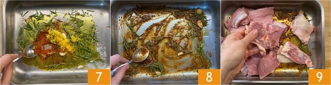 Adicione também o cominho e o coentro em pó 7, misture tudo 8 e coloque dentro as fatias de frango e vitela 9.