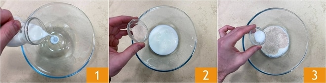 Para preparar os khachapuri, a primeira coisa é colocar em uma tigela o leite morno 1 e o fermento seco 2. Adicione o açúcar para ativá-lo 3 e misture.