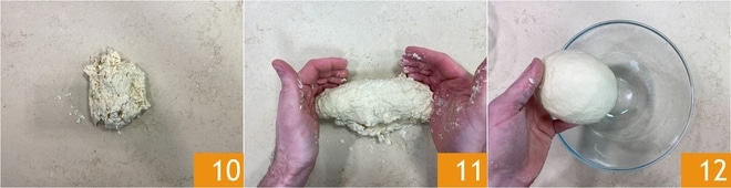 Transfira para uma superfície 10 e trabalhe a mistura com um pouco de farinha até que fique lisa 11. Em seguida, transfira para uma tigela grande 12.