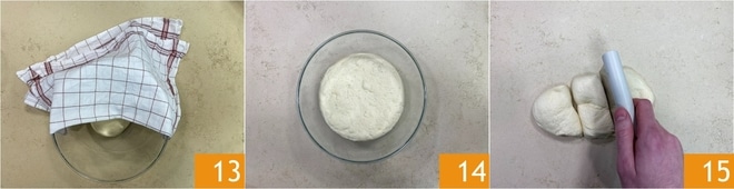 Deixe crescer coberto por cerca de 2 horas em um local morno 13. Quando a massa estiver bem crescida 14, transfira para uma superfície e divida em 3 porções iguais 15.