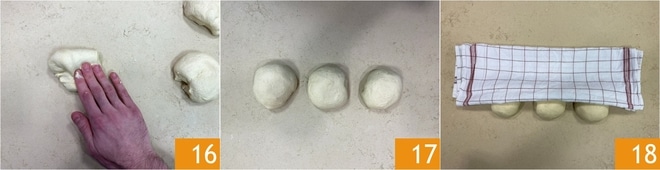 Pegue a primeira porção e forme uma bolinha 16, faça o mesmo com as outras 17 e cubra-as com um pano de prato 18.