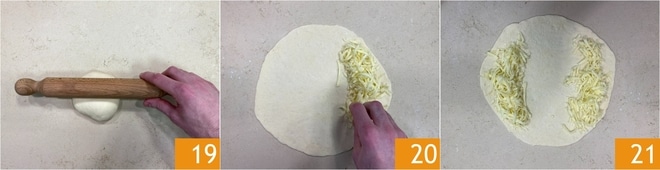 Estique uma até formar um disco 19. Coloque a muçarela ralada em um dos lados 20 e depois no outro 21.
