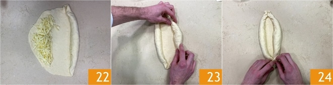 Dobre as bordas enrolando o queijo dentro 22 23, depois aperte as extremidades 24.