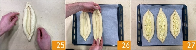 Você deve formar um barquinho 25. Coloque os barquinhos em uma assadeira com papel manteiga 26 e encha o interior com bastante queijo 27.
