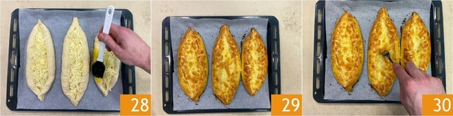 Bata junto a gema e o leite e pincele os khachapuri com a mistura obtida 28. Asse em forno estático pré-aquecido a 190°C por 20-25 minutos. Quando estiverem bem dourados, retire do forno 29 e forme uma cavidade no centro do barquinho, movendo delicadamente o queijo com a ajuda de um garfo.