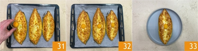 Coloque uma gema no interior 31 e asse novamente por 3 minutos. Retire do forno 32 e sirva seus khachapuri ainda quentes 33!