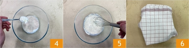 Adicione 2 colheres de sopa de farinha 4 e misture com um batedor 5, depois cubra com um pano de prato 6. Deixe descansar por 5 minutos.