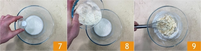 Em seguida, adicione o sal 7 e a farinha restante 8. Misture novamente com o batedor 9, até obter uma mistura homogênea.