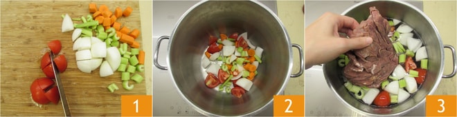 Descasque a cebola e corte-a em pedaços grandes, depois descasque 2 cenouras, corte as extremidades e também corte-as em pedaços. Faça o mesmo com o aipo, depois divida o tomate em 4 partes 1. Em uma panela alta e grande, coloque os legumes para o caldo 2, adicione 4 litros de água e acenda o fogo, depois adicione o lampredotto 3.