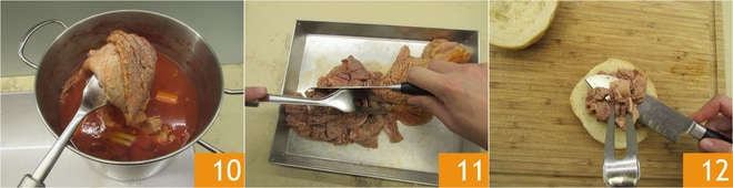 Enquanto isso, o lampredotto estará pronto 10, transfira-o para uma bandeja ou tábua de aço e corte-o de modo a misturar a parte mais magra com a mais gorda 11. Distribua um pouco de lampredotto na base do pão 12.