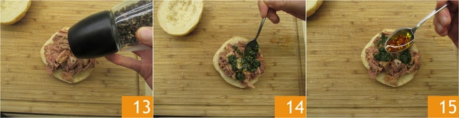 Tempere com uma boa pitada de sal, uma pitada de pimenta 13, uma colher de chá de molho verde 14 e, se desejar, um fio de óleo picante 15.