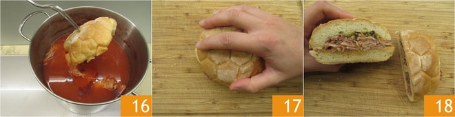 Você pode mergulhar brevemente no caldo a metade superior do pão 16 antes de fechar 17 e saborear seu pão com lampredotto 18!