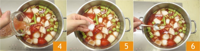 Adicione o purê de tomate 4, o concentrado, o sal grosso 5, a pimenta moída, orégano seco e canela em pó 6.
