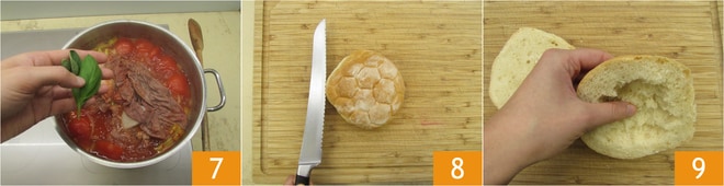 Adicione também as ervas (manjericão, sálvia, hortelã) 7. Misture e deixe cozinhar por cerca de uma hora, com a tampa. Não será necessário retirar a espuma do caldo. Após uma hora, divida ao meio cada pão 8, depois remova parte do miolo da tampa 9.
