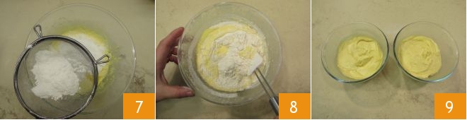 e a farinha peneirada, junto com o fermento 7. Misture delicadamente com uma colher de pau 8. Quando a farinha estiver completamente absorvida, divida a massa em duas tigelas 9; você deve colocar cerca de 375 gramas em cada uma.