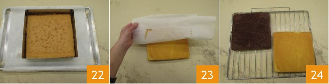 Quando o bolo branco também estiver assado, retire-o do forno 22. Como feito anteriormente, espere um pouco antes de remover a forma, o papel manteiga 23 e deixe esfriar também este sobre a grade 24.