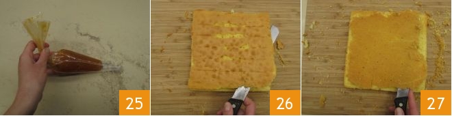 Coloque a geleia em um saco de confeitar 25, será mais fácil rechear o doce. Quando ambos os bolos estiverem completamente frios, limpe-os da crostinha externa superior e inferior (26-27), de modo a obter apenas o coração.