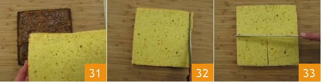 Coloque por cima também o bolo branco 31 e deixe o doce esfriar na geladeira por cerca de dez minutos. Depois, usando uma faca, apare as bordas externas 32. Em seguida, corte-o primeiro ao meio no sentido do comprimento e depois ao meio no sentido da largura para obter 4 retângulos 33