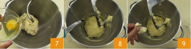 Neste ponto, adicione o ovo 7 e continue a trabalhar até que esteja completamente absorvido. Em seguida, adicione as sementes da fava de baunilha 8 e o primeiro pedaço de manteiga 9. Ligue a máquina novamente e adicione a manteiga aos poucos até que a massa a tenha absorvido completamente.