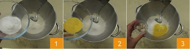Para preparar os lanchinhos de massa brioche com chocolate, a primeira coisa a fazer é preparar a massa. Despeje na tigela de uma batedeira a farinha 0, a de arroz 1 e a de milho 2. Em seguida, adicione o fermento esfarelado 3,