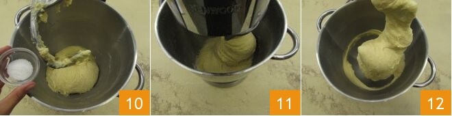 Adicione então o sal 10 e continue a trabalhar em velocidade média 11 até que a massa esteja elástica 12. Isso levará cerca de 8 minutos.