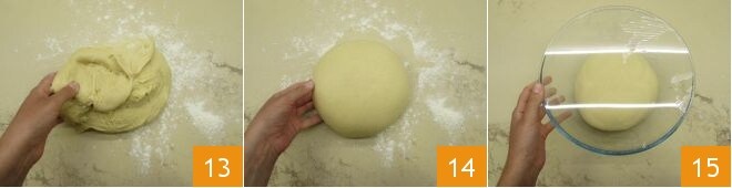 Despeje a massa em uma superfície levemente enfarinhada 13 e dê-lhe uma forma esférica 14. Transfira-a para dentro de uma tigela e cubra com filme plástico 15. Deixe crescer por cerca de 2 horas em temperatura ambiente, longe de correntes de ar ou no forno desligado apenas com a luz acesa.