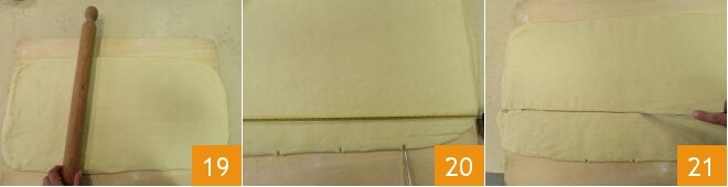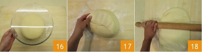 Quando a massa tiver dobrado de volume 16, transfira-a para uma superfície levemente enfarinhada 17. Estenda-a usando um rolo de massa 18