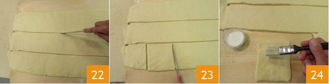 e depois outra, também de 10 cm 22, de forma a obter 3. Neste ponto, corte de cada tira 6 quadrados (10x10 cm) 23, para obter um total de 18 peças. Mergulhe um pincel no leite e use-o para pincelar apenas a metade superior de cada quadrado 24.