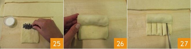 Ponha então algumas colheres de chá de gotas de chocolate na extremidade recém-umedecida 25 e enrole-a em sua direção até a metade do quadrado 26. Faça 5 tiras da mesma largura na parte restante 27.