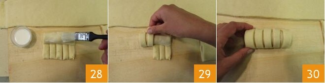Pincele com leite o corpo do brioche 28 e levante as tiras de modo que elas adiram, cobrindo a parte recheada (29-30).