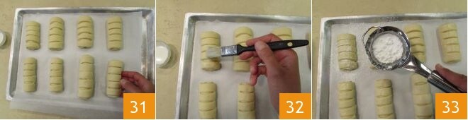 Transfira os brioches para uma assadeira forrada com papel manteiga 31, pincele a superfície com leite 32 e polvilhe com açúcar de confeiteiro 33.