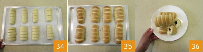 Deixe crescer por mais 30 minutos em temperatura ambiente 34, depois asse em forno estático, pré-aquecido a 185° por 20 minutos no meio da prateleira. Retire do forno 35 e deixe esfriar antes de servir 36.