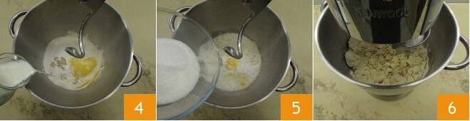 o leite 4 e o açúcar 5. Comece a amassar tudo com o gancho 6 até que os ingredientes estejam bem misturados.