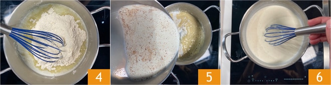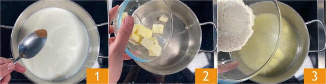 Para preparar a lasanha ao ragu de lentilhas, comece pelo molho bechamel: coloque o leite em uma panela, adicione a noz-moscada 1 e o sal, depois aqueça. Coloque a manteiga em outra panela 2 e derreta em fogo baixo, depois adicione a farinha de uma só vez 3.