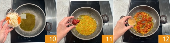 Em uma panela grande, coloque um fio de óleo e o picadinho para o refogado 10; deixe dourar por cerca de 10 minutos, mexendo frequentemente. Depois, adicione o extrato de tomate 11 e o gengibre em pó 12.