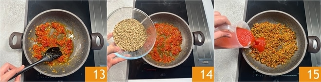 Deixe o fundo pegar sabor rapidamente 13 e adicione as lentilhas 14. Misture e cubra com o purê de tomate 15, adicionando a água necessária para cobrir a nível.