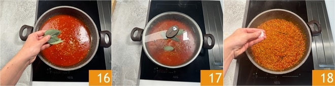 Aromatize com algumas folhas de sálvia 16, tampe 17 e deixe cozinhar suavemente por 40 minutos, mexendo de vez em quando e adicionando água se necessário. Perto do final do cozimento, ajuste o sal 18 e a pimenta.