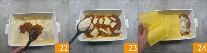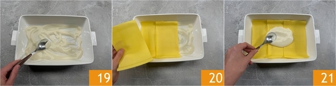 Corte a provolone em fatias muito finas e irregulares e comece a montar a lasanha. Em uma travessa para 4-6 pessoas, distribua no fundo uma camada de molho bechamel 19, depois prossiga com uma camada de lasanha (3 folhas, ligeiramente sobrepostas) 20, continue com uma camada de molho bechamel 21.