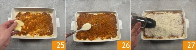 Prossiga 25 realizando um total de 3 camadas. Na última camada, distribua bastante ragu 26, evitando o provolone, e abundando com parmesão ralado 27. Complete com uma pitada de pimenta 27