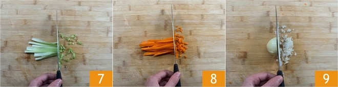 Cuide do ragu de lentilhas: lave, limpe e pique o aipo 7, a cenoura 8 e a cebola 9 para o refogado.